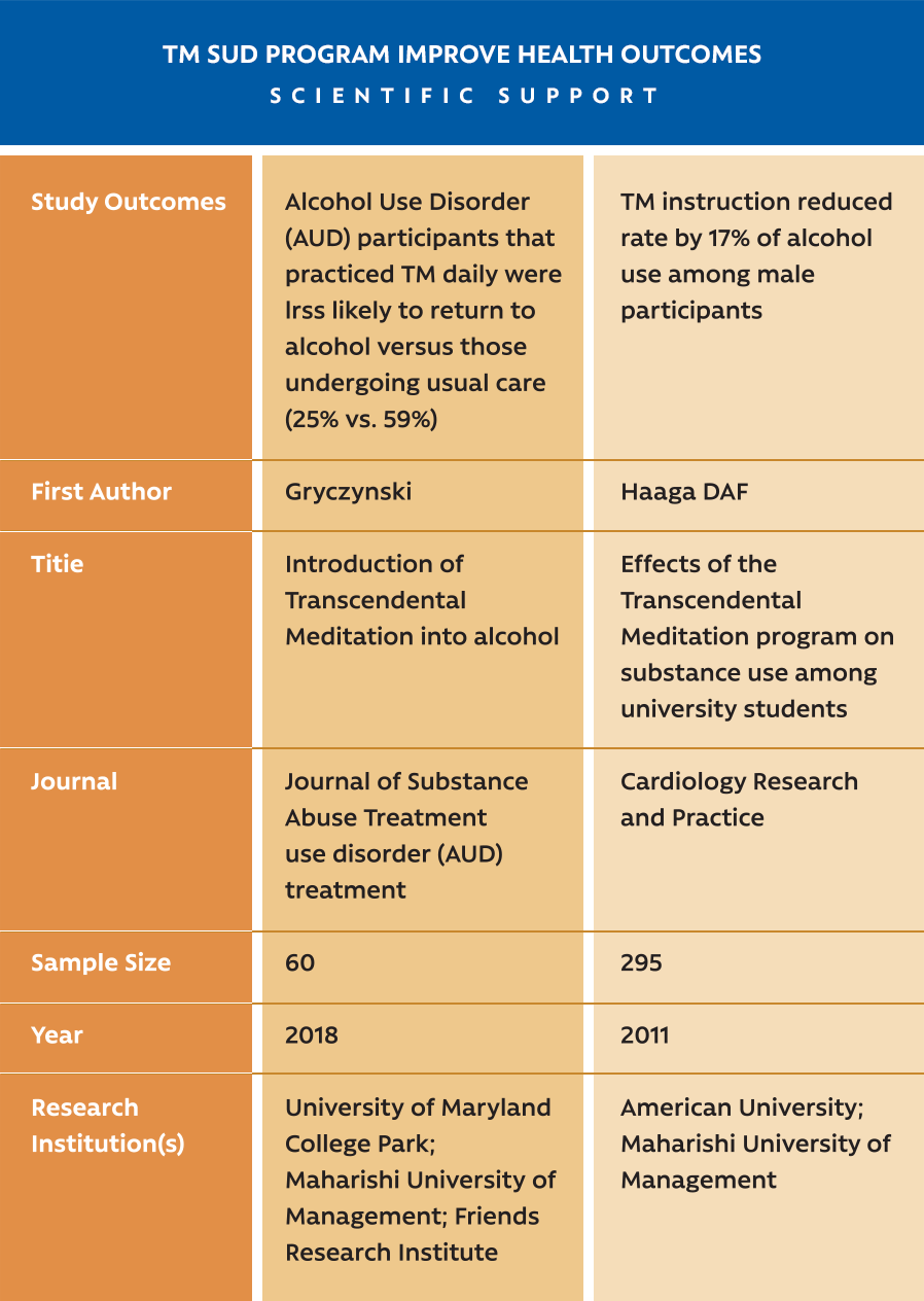 Several statistical meta-analyses have indicated that the TM technique produces significantly larger reductions in tobacco, alcohol, and non-prescribed drug use than standard substance abuse treatments and standard prevention programs. Whereas the effects of conventional programs typically fall off rapidly within three months, effects of the TM technique increase over time. References: 1. Alcoholism Treatment Quarterly 11 (1994): 13–87. 2. Cardiology Research and Practice (2011): 1-8.